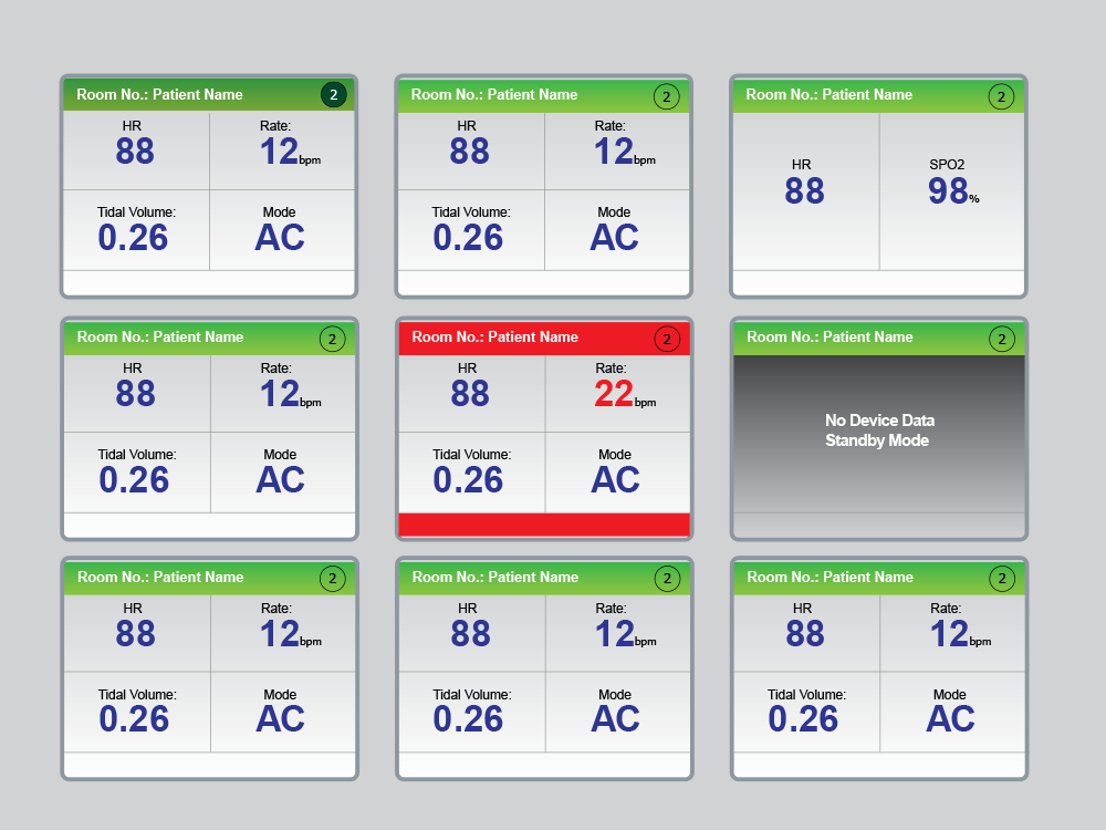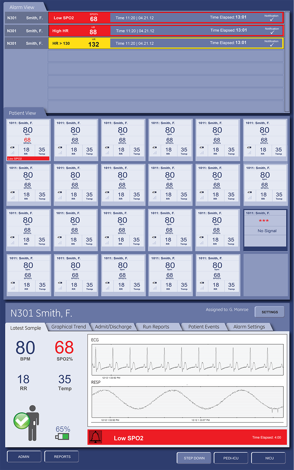 Overview: Central Nurse Station dashboard showing patient tiles with medical device data integrated from multiple vendors showing different and sometimes similar values. User interface designed for touchscreen allowing for rapid patient admit/discharge, device assignment, as well as alarm heirarchy and escalation.