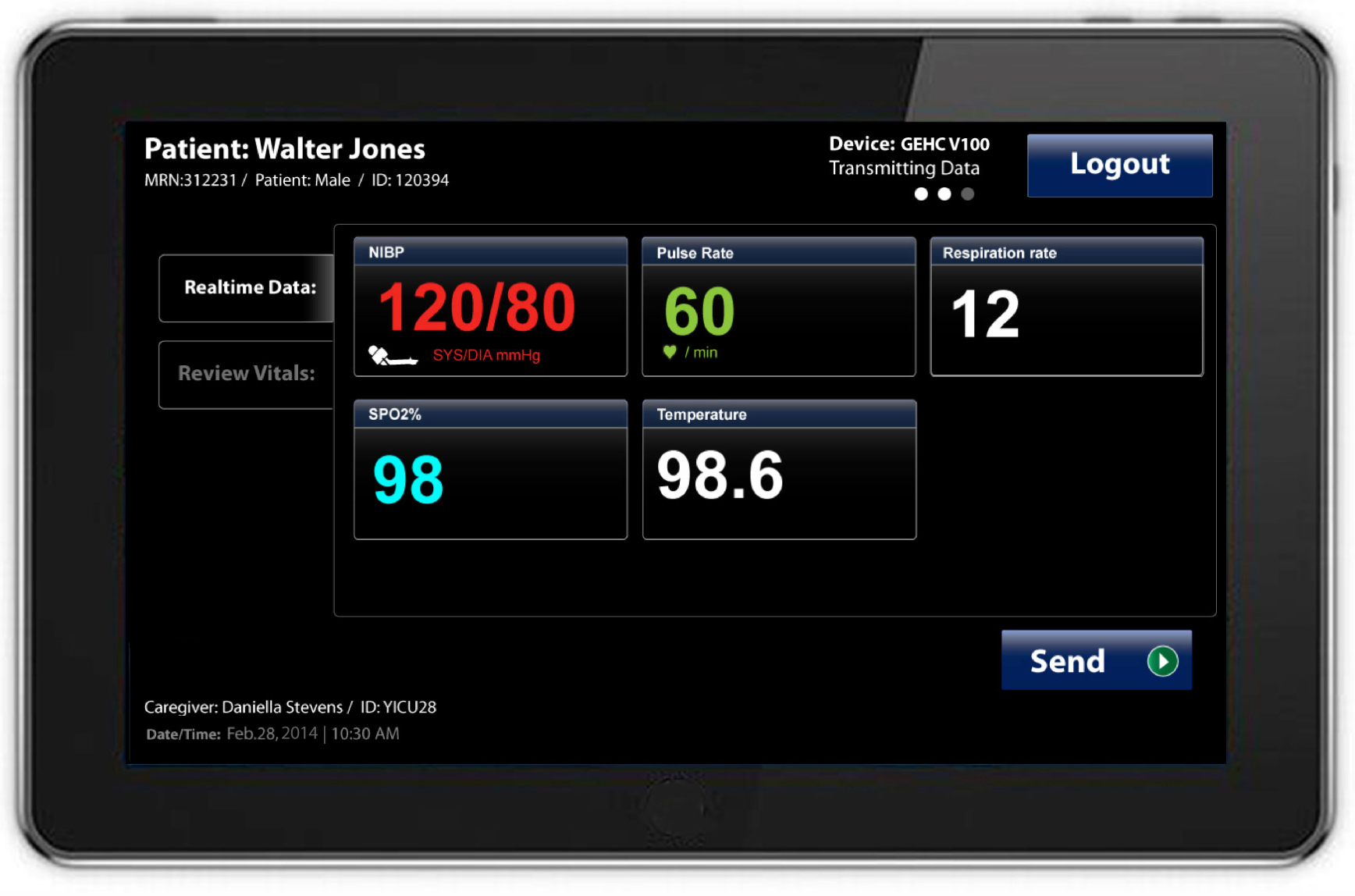 This concept was developed to demonstrate clinicians incorporating real-time device data, and spot check (vitals) data and sending this data to the EMR via tablet interface.