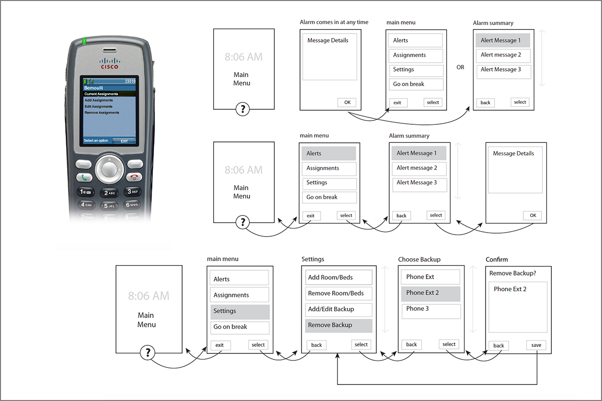Features: Utilize primitive Cisco phone UI to incorporate patient data, alarms, and clinician (and room/bed) assigments